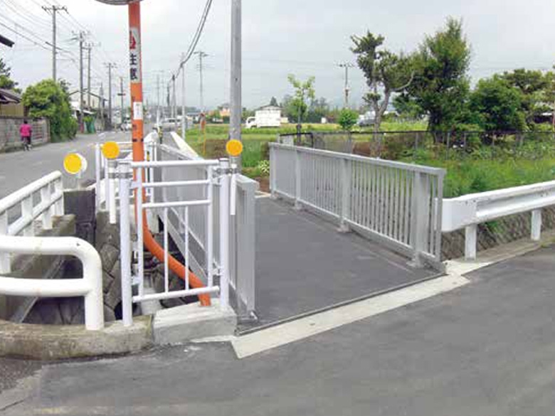 「アルミ床版- コンパクトブリッジ」は、歩道が確保されていなかった小さな橋梁に、歩道を添架する簡易橋梁です。