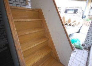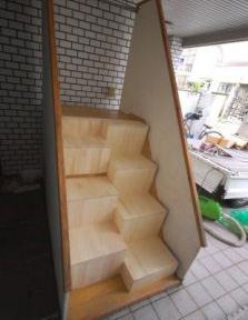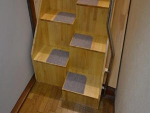 らくらくだー階段(ゆるゆる階段)は、既存の急な階段の上に互い違い階段を取り付けて、バリアフリー法に規定する蹴上げ16cmにする手法です。踏面が狭く足が乗らないような急な階段を、リフォームなしで蹴上げを低くし踏面を広くします。