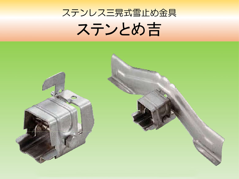 「ステンとめ吉」は、ステンレス三晃式雪止め金具です。腐食に強いsus304ステンレス製で、海に近く