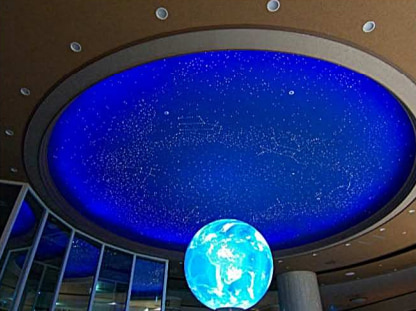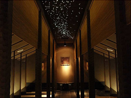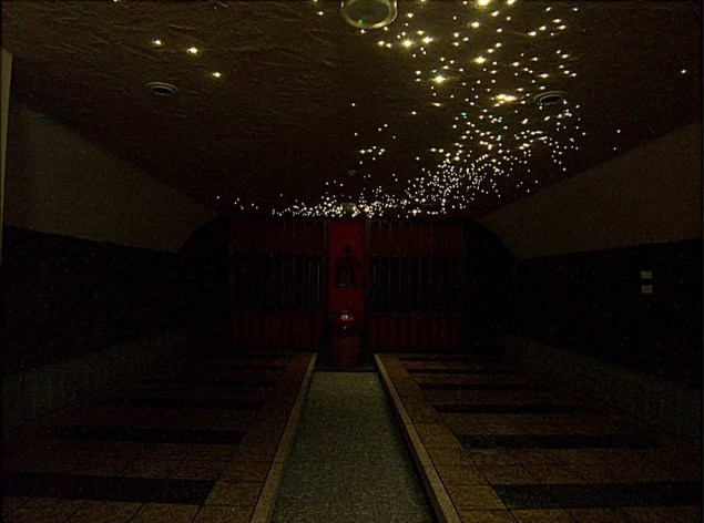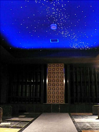 「星空天井演出」は、光ファイバーを使用した星空天井です。光源器につながった光ファイバーの束を1本1本間隔をあけて、天井表面に露出させ端面を特殊加工した光演出です。光源の光がファイバーの中を通って、ファイバーの切断端面が光るので、漏電の心配もなく高温多湿の場所でも施工可能です。
