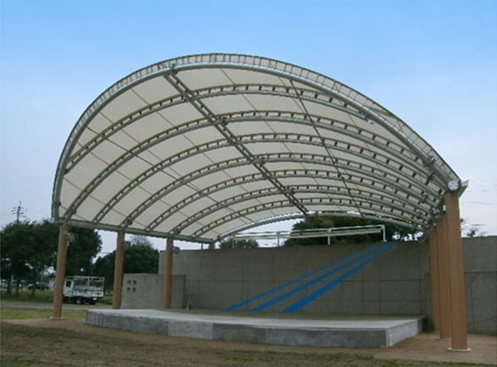 膜屋根とは、膜構造建築物の製品の一つ。厚さ1mm以下のガラス繊維や合成繊維にPVCやふっ素樹脂をコーティングした膜材料を用いた屋根のこと。