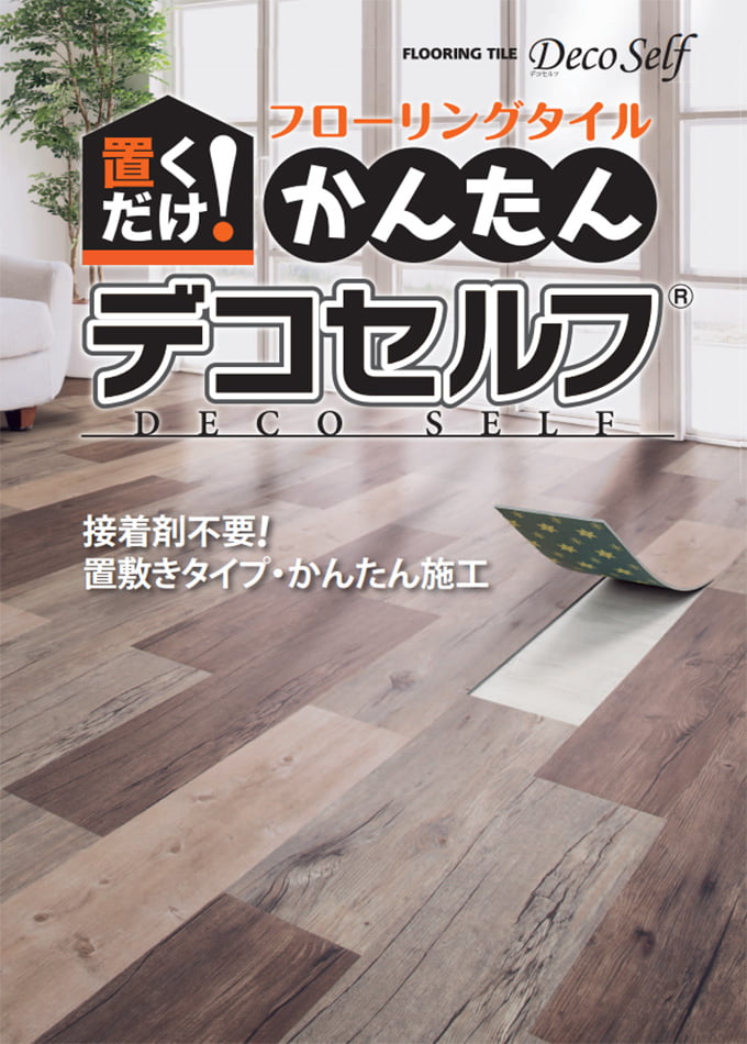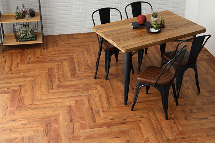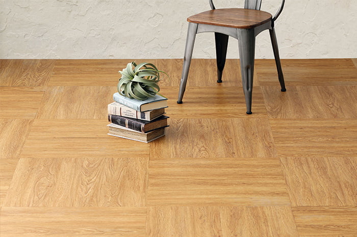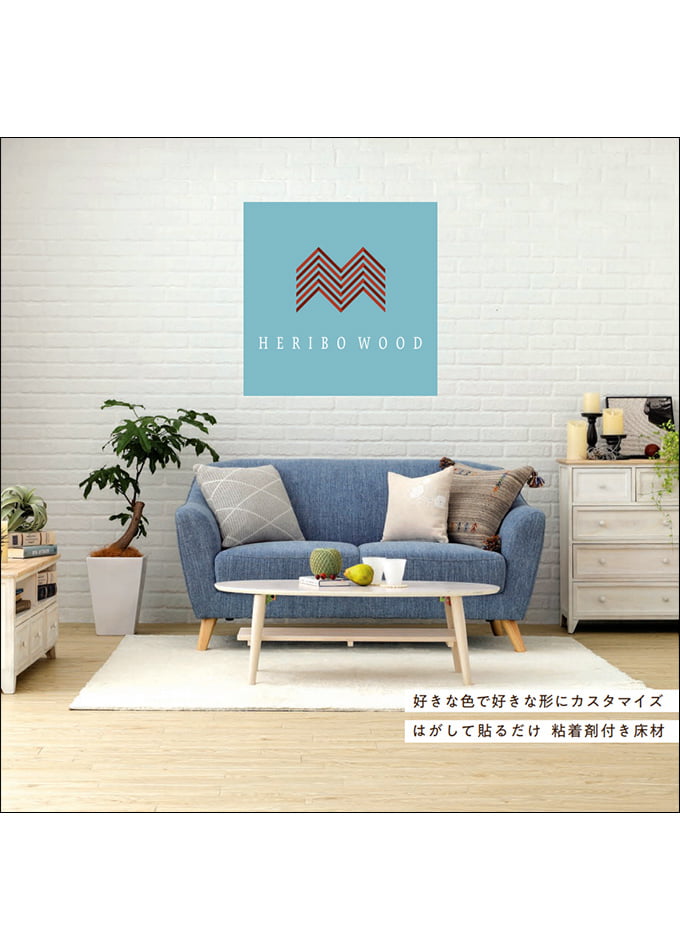 「ヘリボウッド」は、好きな色で好きな形にカスタマイズできる、はがして貼るだけの粘着剤付き床材です。
