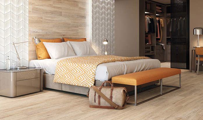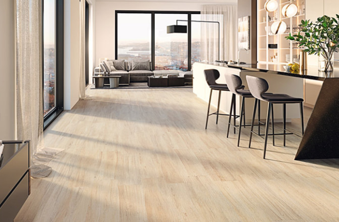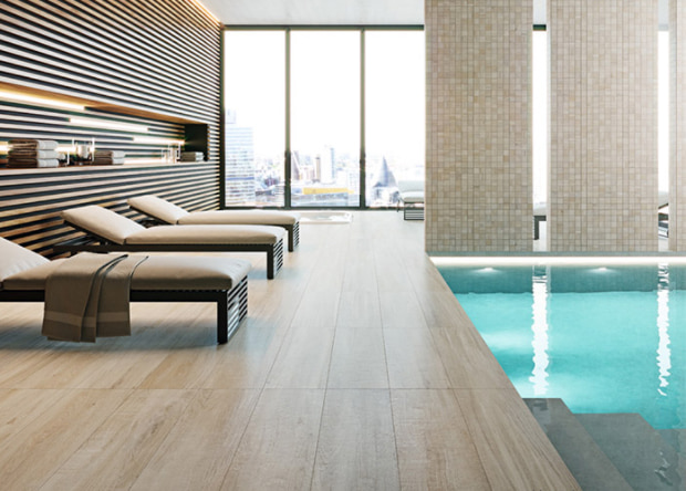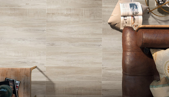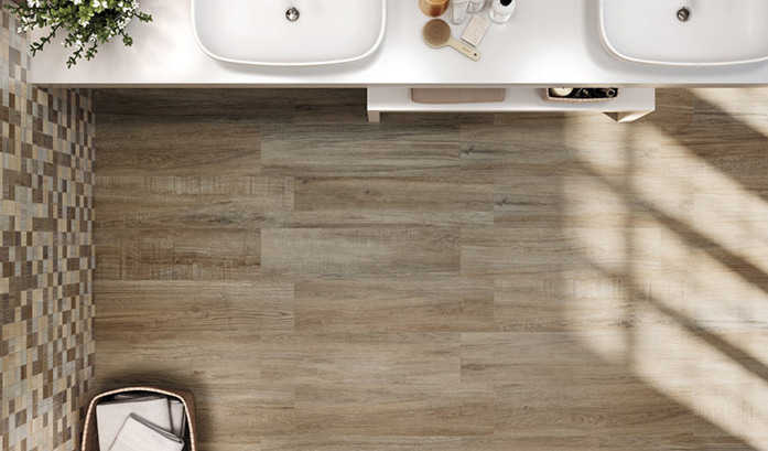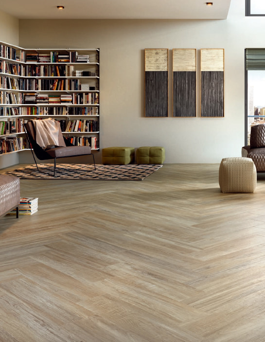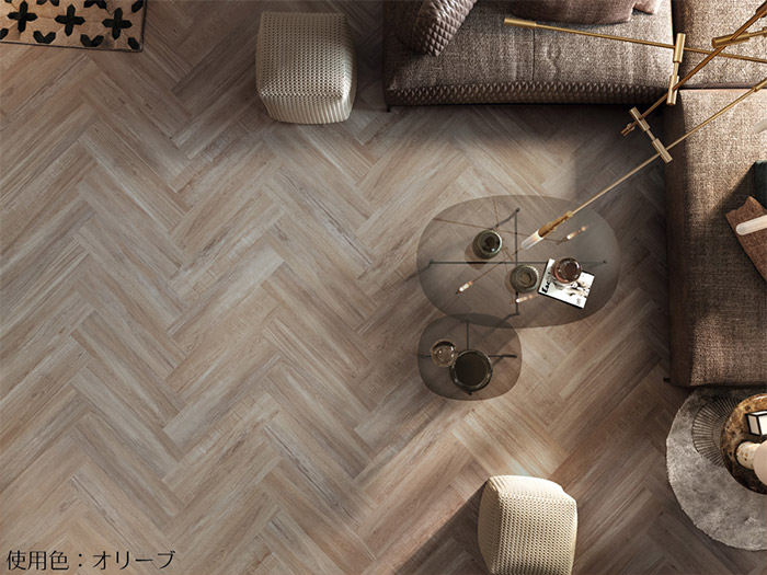 落着きと懐かしさを感じる色合いの、磁器質木目調床タイルです。セラミックタイルならではの高い耐久性があるため、天然木では再現が難しかったシーンでも使用が可能です。