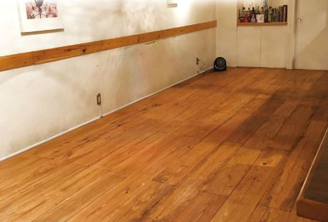 「カフェ板塗装品(スギ無垢厚板)」は、国産杉の大径木から切り出した厚み30mmの床板「カフェ板」に、自然系着色
