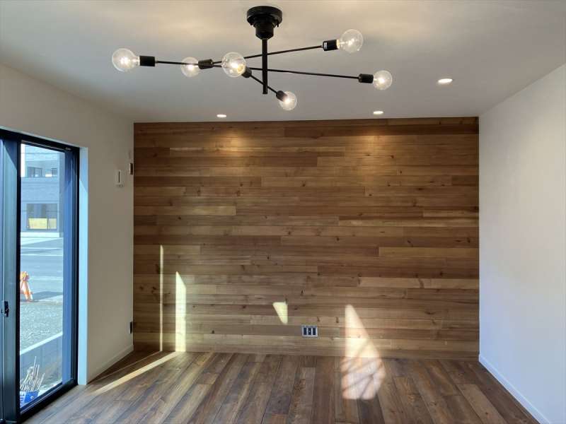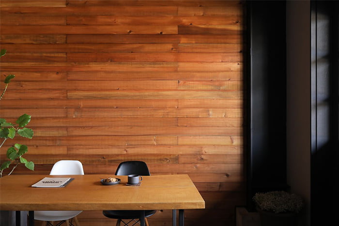 三重の杉で作られた無垢のヴィンテージ材を壁一面に貼る