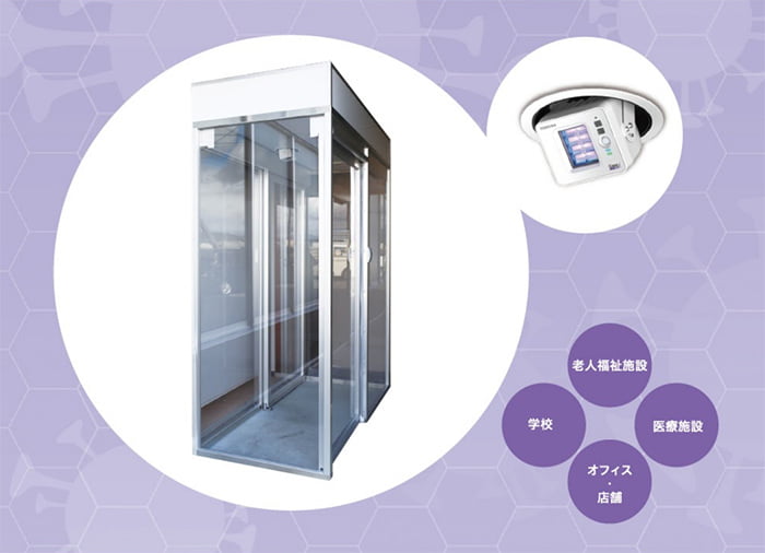 非接触スイッチで正面自動扉を開き、除菌ブースへ入場。