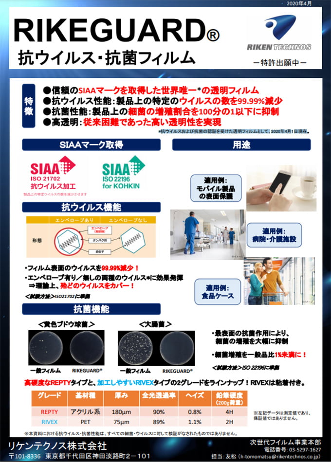 抗ウイルス・抗菌フィルム「RIKEGUARD」のカタログです。【製品の特徴】