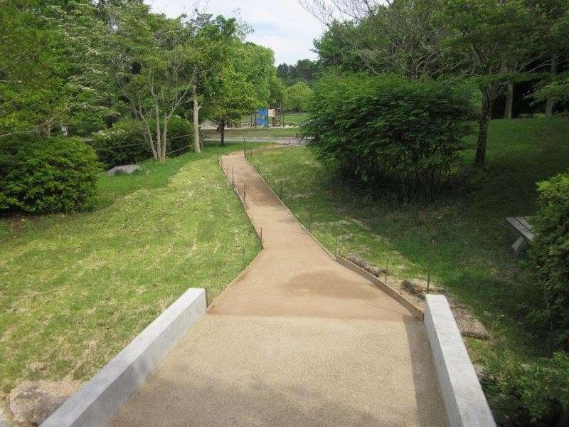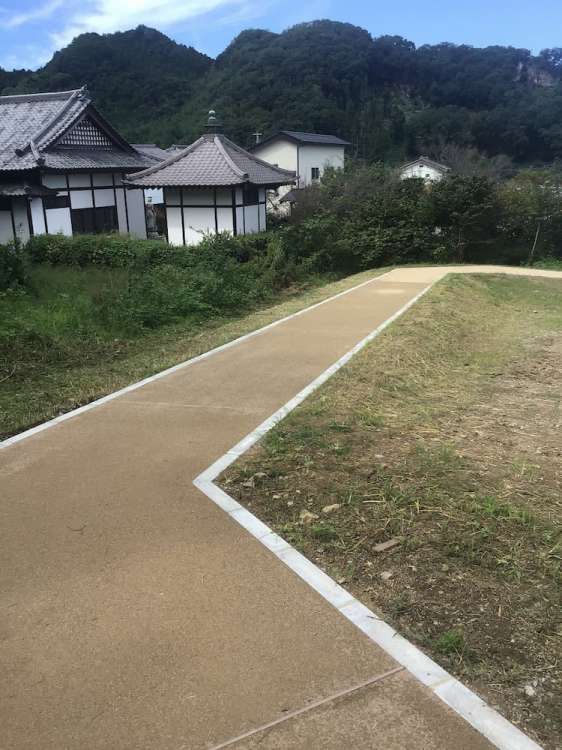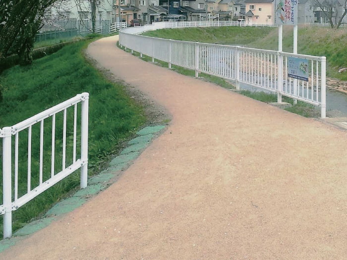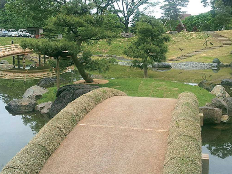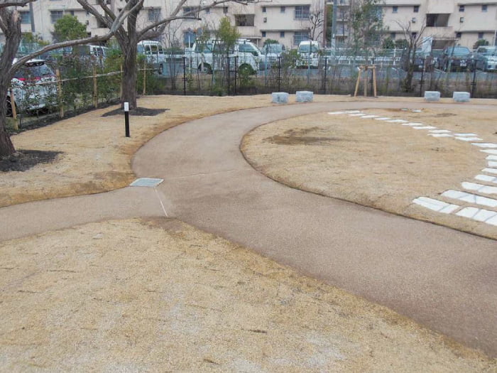 被覆土舗装材「化粧マサ」は、オーバーレイ工法を用い、既存のアスファルト・コンクリート舗装を撤去することなく、簡単に土舗装に生まれ変わらせることが可能。コケやカビの抑制機能もあり、自然土の落ち着いた質感で景観も良く、照り返しを抑える効果もあります。