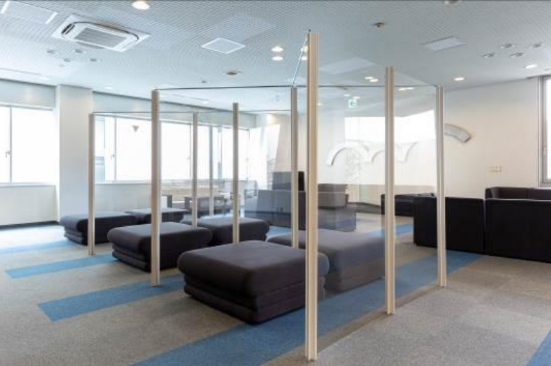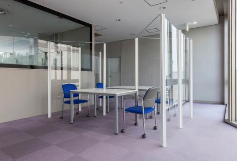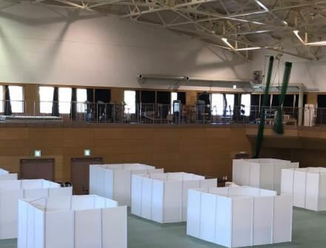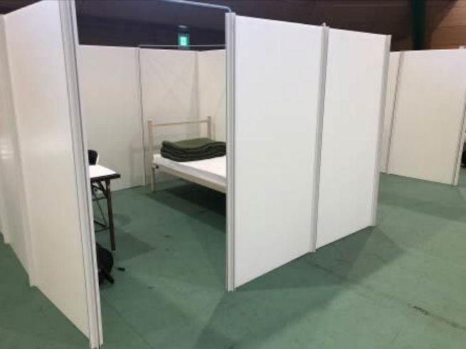 避難所向けの組立式間仕切「ファミプラ」。高さが約1.8mあるので、飛沫を防ぎ、視線を遮ることでプライバシーを守ります。