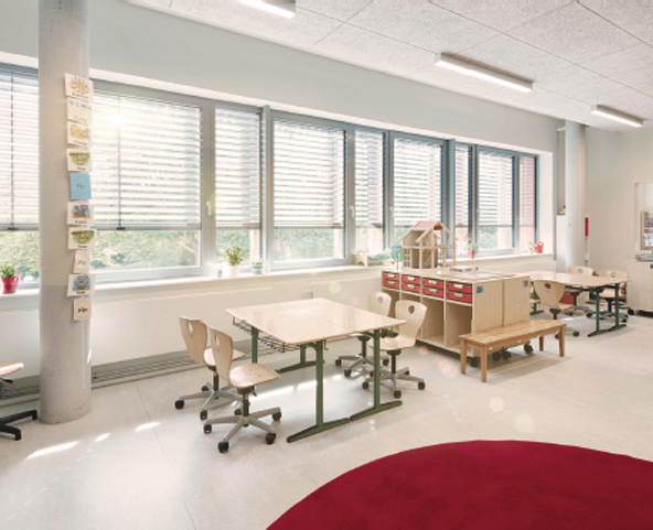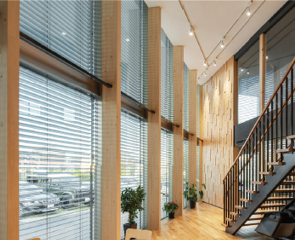 建物の外部に取り付けることで、効率的な日射コントロールを実現。スラットの角度を調整し、まぶしさを軽減しながら明るさを保持。