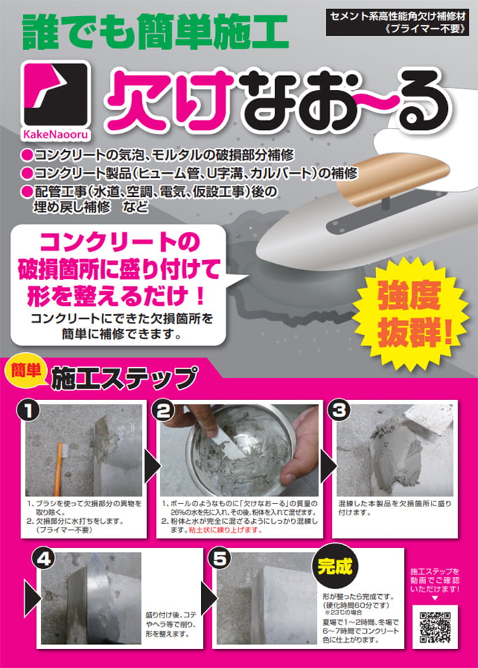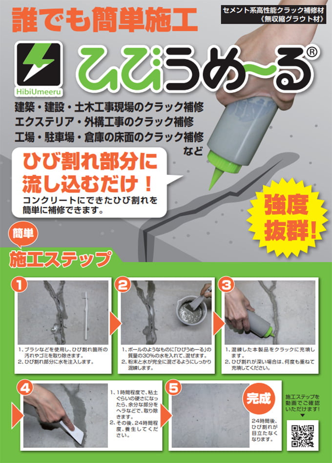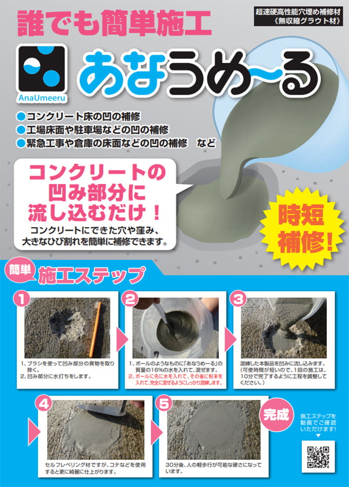 「あなうめ~る」は、誰でも簡単に施工できる、セメント系超速硬穴うめ補修材。
