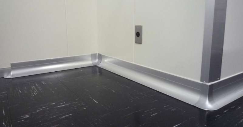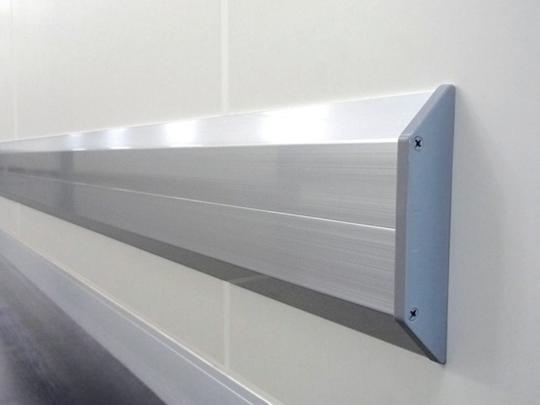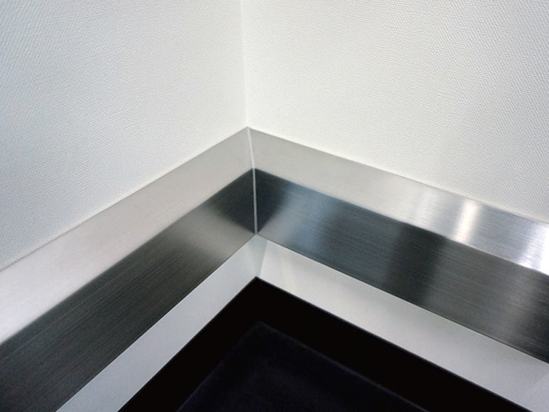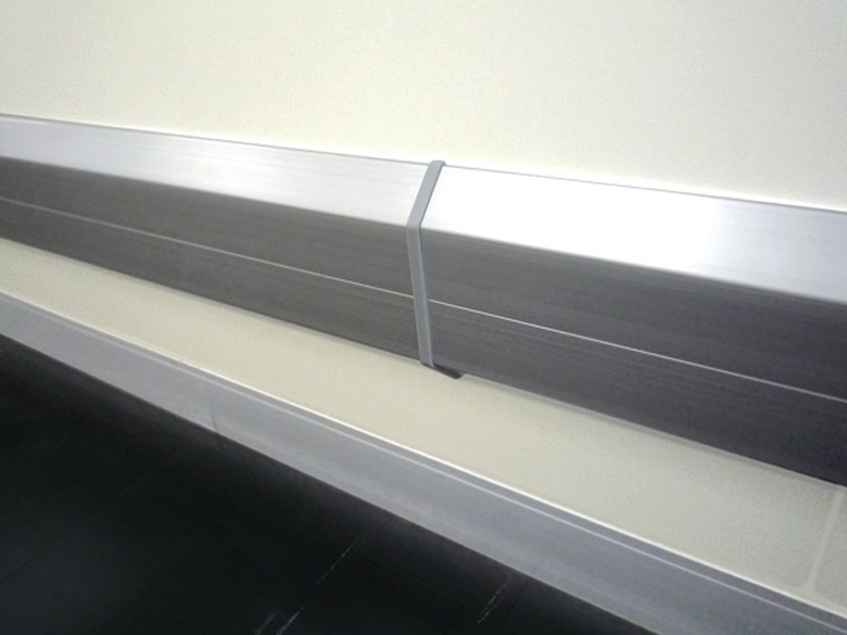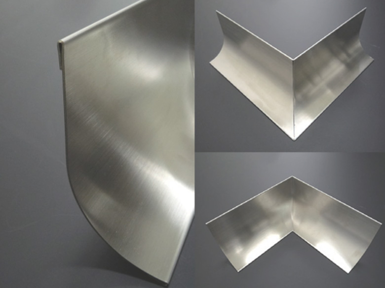 通常の巾木は床と直角になっているため埃が溜まりやすいが、R巾木はそういった空間を無くすことで掃除がしやすくなりました。メタラップとは、 金属形材または樹脂形材にステンレス箔 (SUS304) をラッピングしたもの。