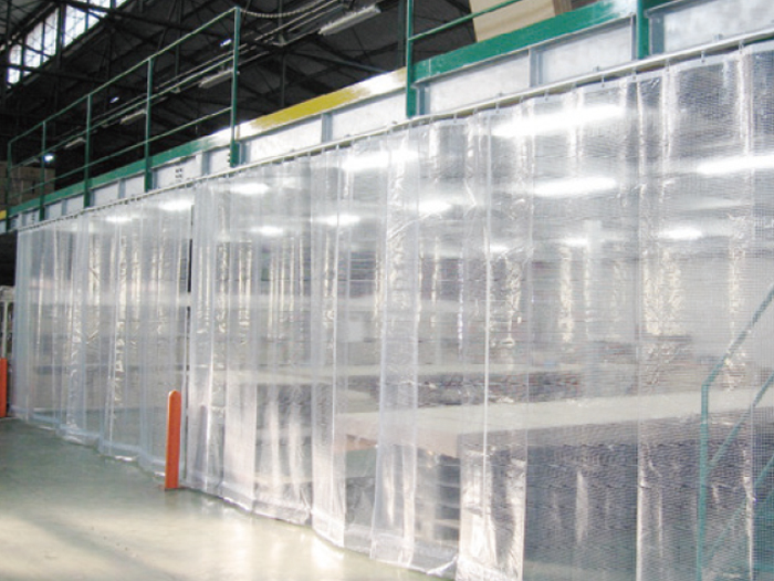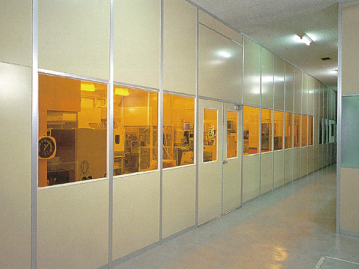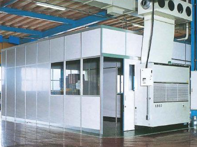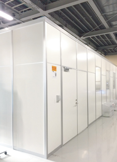 工場内に独立した環境を創りだす、天井付パーティションシステム。スペースの有効利用のために架台上に部屋を作ったり、特殊な作業工程を分けるためにラインの一部に組み込んだり、使用条件に合わせた設置方法と豊富なバリエーション。