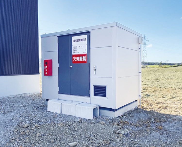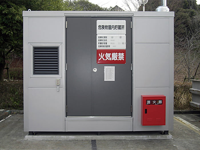 大和リースの「危険物貯蔵庫」は、スピーディーに設置できるユニット型。法令に準じる必要な設備は標準装備しています。