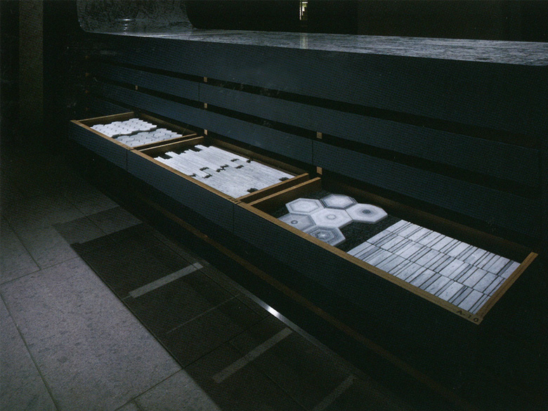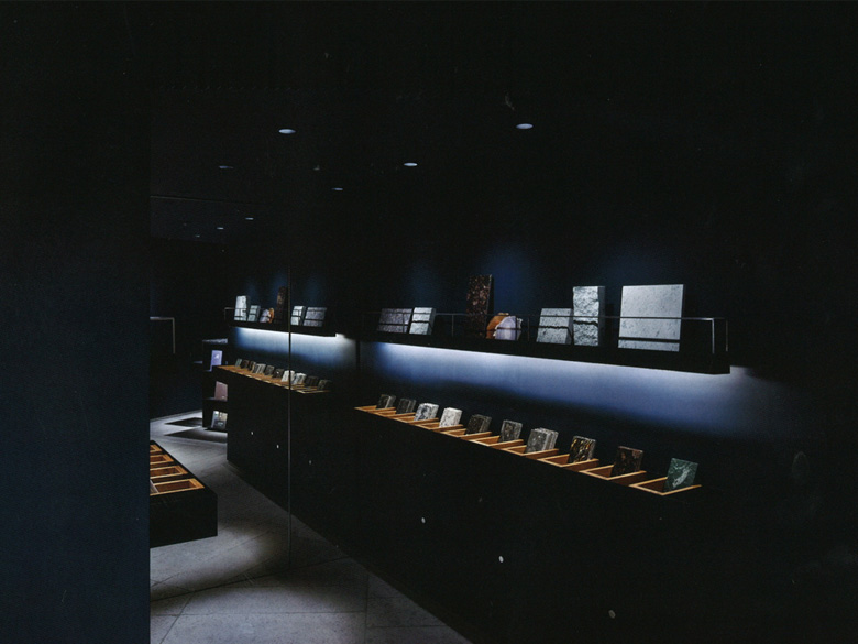 「STONES」では、空間全体の照度を下げながら、引き出しの石材は適度な明るさで見ることができるライティングが施されている。