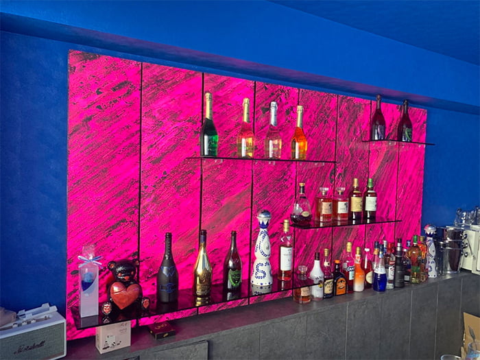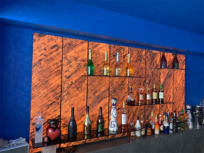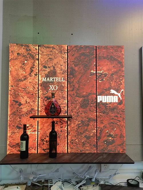 壁面の背景はいくつかのスタイルから選択でき、商品や社名のロゴを入れた製作も可能。