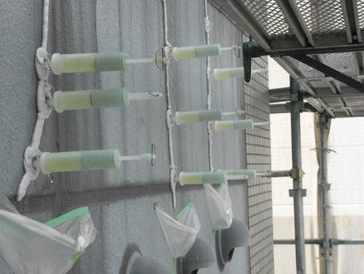 コンクリート構造物の強度回復及び増強効果が発揮出来る唯一の樹脂注入工法。樹脂注入時におけるエアー抜きと、加圧力の超低加圧コントロール(0.02~0.06N/m㎡)による躯体への樹脂高密度充填により、構造物内の0.1mm巾以下のクラックへの樹脂注入が可能。