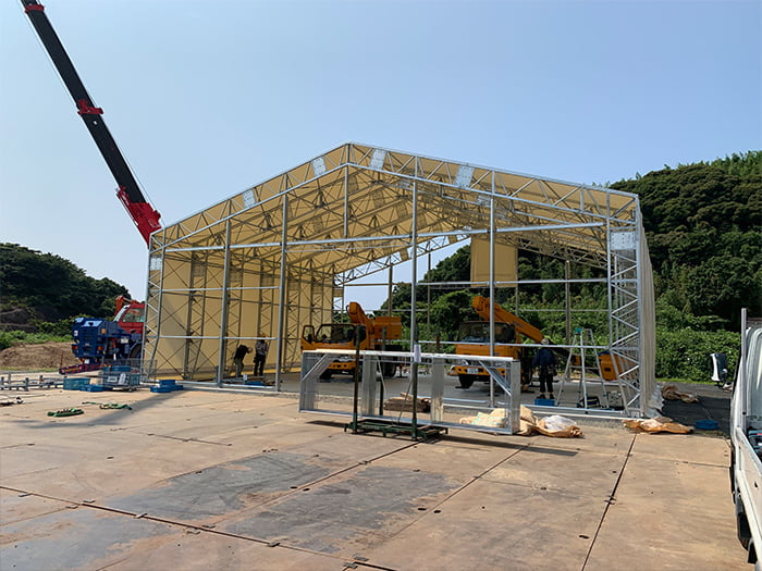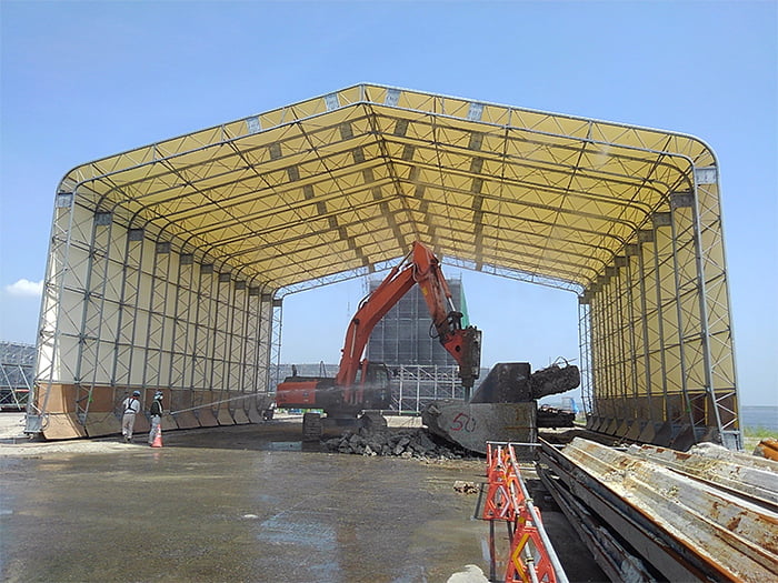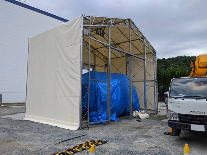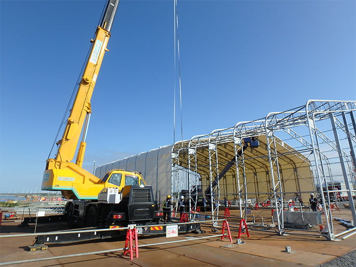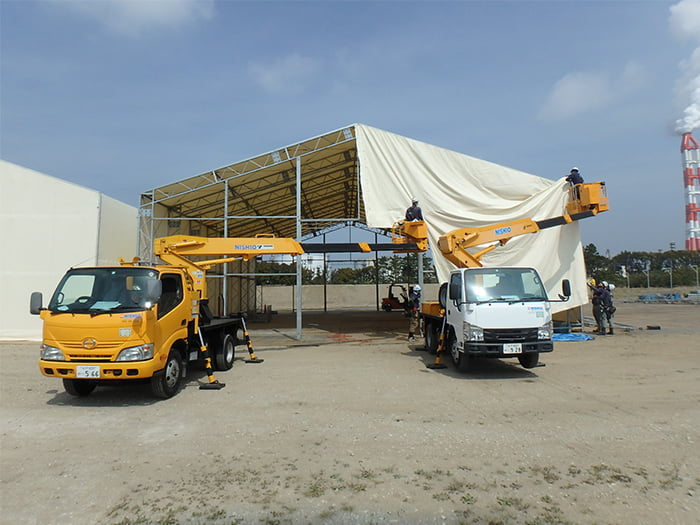 総合レンタル業務のパイオニア、西尾レントオールによる、安全性・経済性を重視した大型テントレンタル。資材、機材保管・建替工事(代替テント)などに向いている通常タイプ、大型重機での作業が可能な軒高タイプ、積雪対策に適した積雪対応テントTFSタイプ、長尺資材の吊り込み保管ができる可動式テント(ノーマル可動テント・スライド式 Wテント)、テント内部の作業が外部から見られない防音テントがあります。