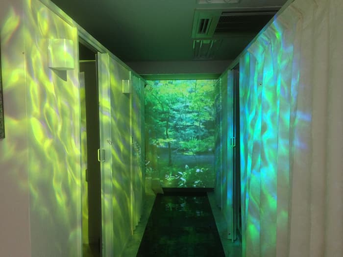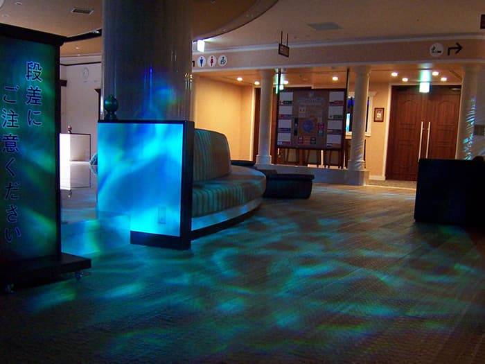 株式会社ミューでは、映像や光、音楽、水など多彩な演出を行っています。水の揺らぎ照明は、ゆらゆら揺れる水の波紋を壁や天井に投影。