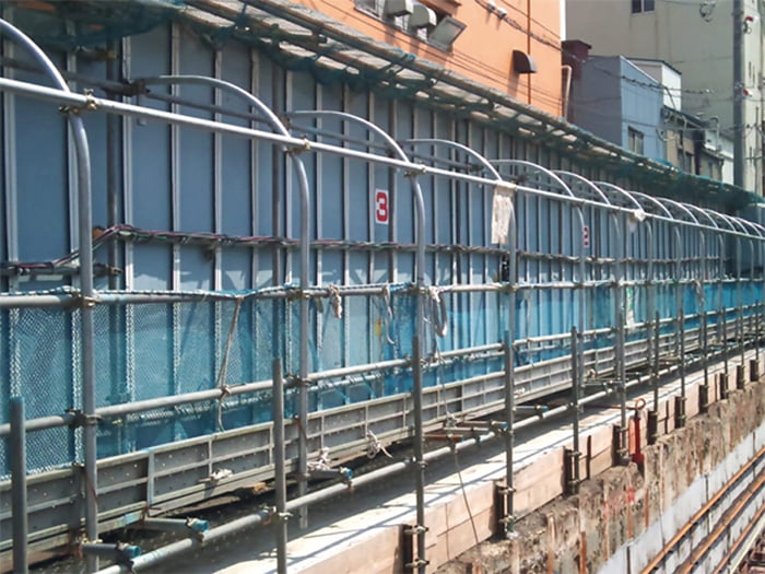 工事現場の仮囲い(アドフラットパネル・安全鋼板など)裏のスペースを利用して作業通路を確保します。