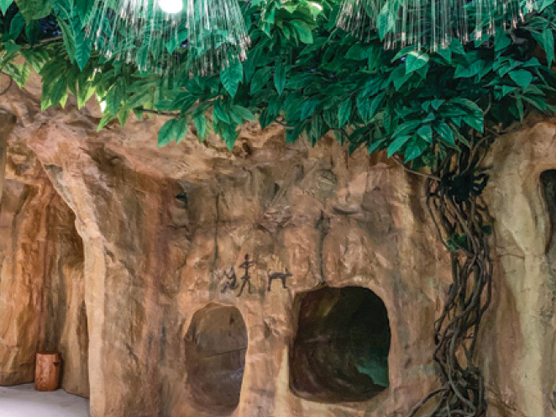 実際の岩から型を取った岩のリアルな表面形状と鍾乳石と石筍、化石、溶岩、水溜のような本物の洞窟の特徴を持つテーマをラインナップ。本物の洞窟に似た部屋と高いトンネルで作られた洞窟体験は探検的で教育的です。