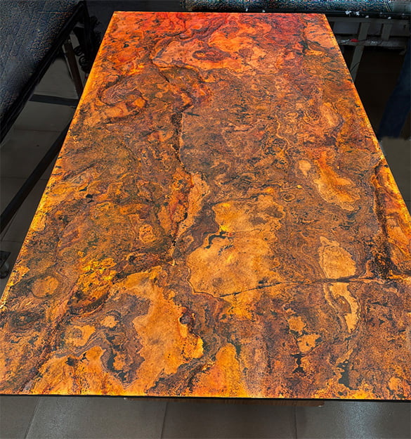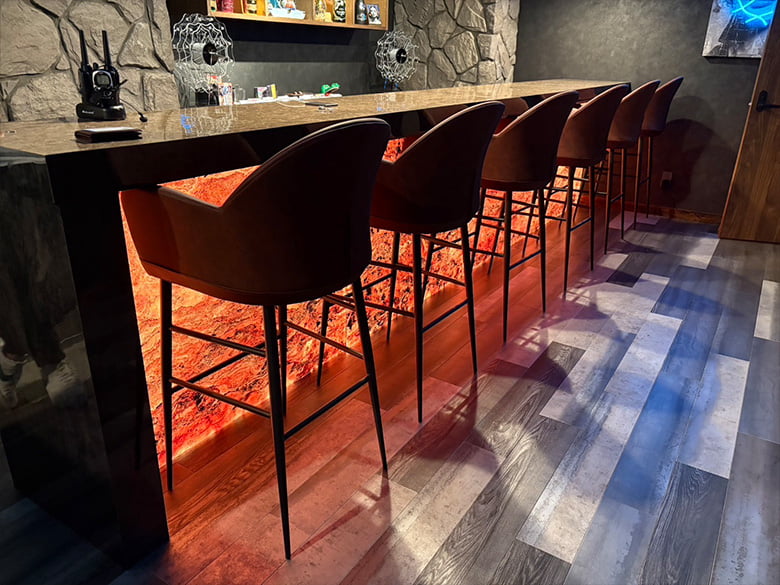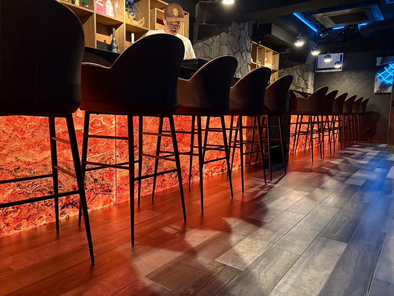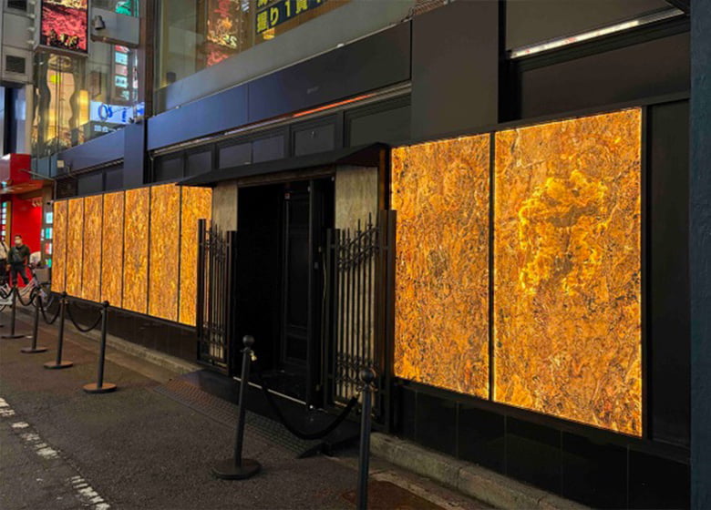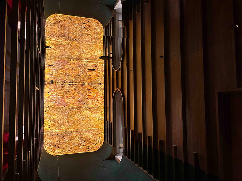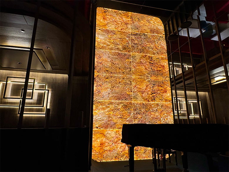 「Lumi オニキス」は、自然石と面発光パネルを一体化させた“光る建材”。グレアのない幻想的な空間を演出できます。