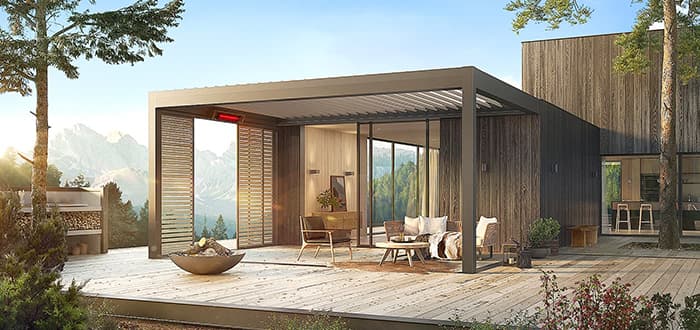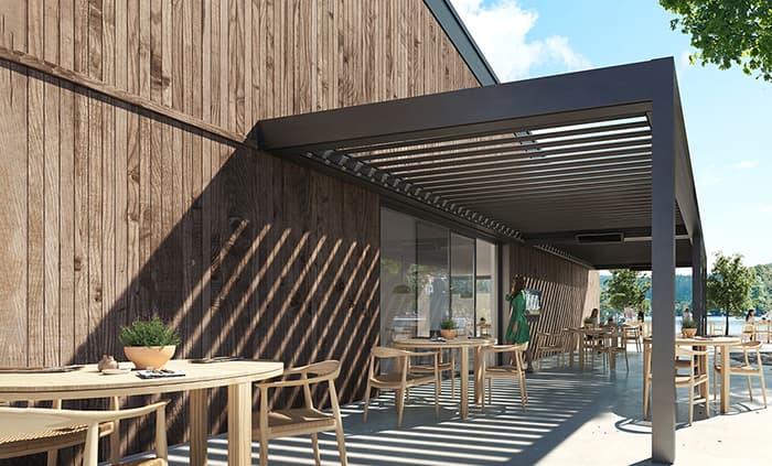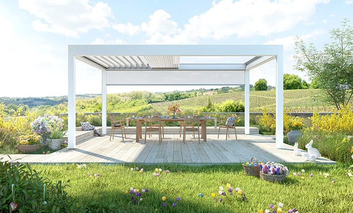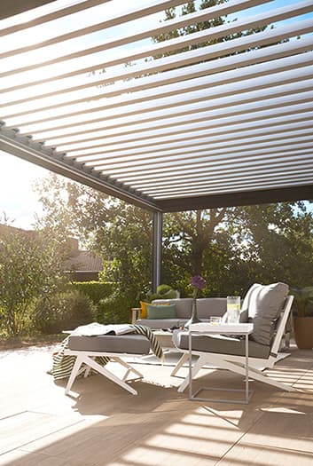 ルーフシステムで風や悪天候に邪魔されないアウトドアスペースを実現し、稼働式のため太陽の光を調整することができます。