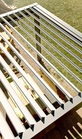「Lamaxa(ラマクサ)」は、アウトドアリビングやガーデンルームとして、お庭での暮らしを⼀年中楽しむことができます。スラットルーフLamaxaは、モーターで稼働可能なアルミ製のスラットがついた屋根材です。
