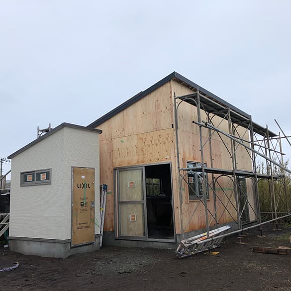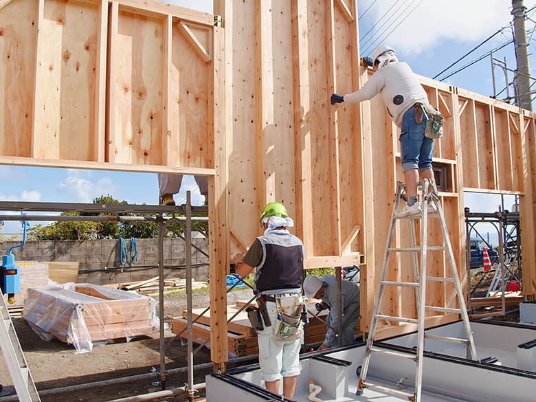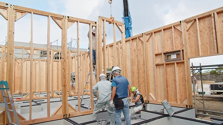 一般的に普及している小口径構造材(柱・梁・土台)等を使い、「在来軸組工法」と「枠組み壁工法」を組合わせた構法。木造建物の床・壁・間仕切・小屋・屋根を「パネル化」。