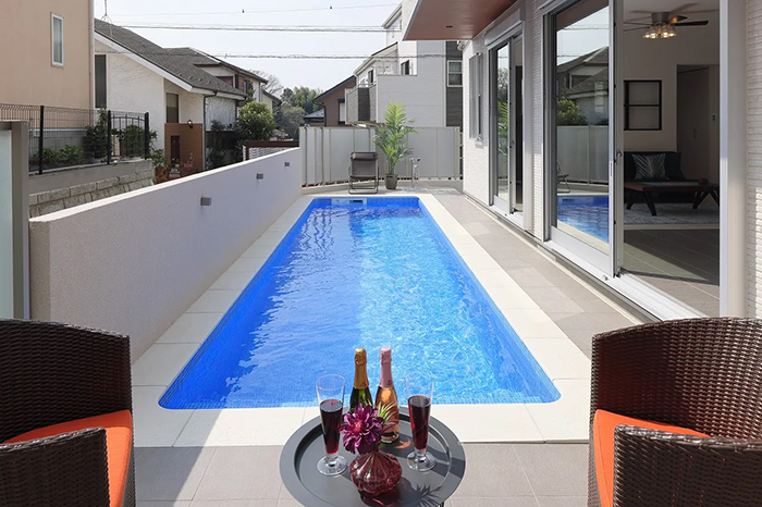 マジラインプールは、オーダーメイド型プール。敷地条件や建物とのつながり、色々なアイディアでプールの形、サイズ、ステップなどをデザイン出来ます。