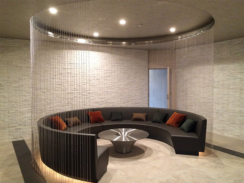 金属チェーンの上品さと重厚感が特徴の「カテラ」は、チェーンカーテンタイプや固定式プレートタイプなどがあります。金属チェーンは表情豊かで、照明との組み合わせで空間に生命を吹き込みます。