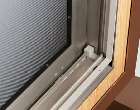 外側から調整できる外れ止めを独自開発し、外からつけられる網戸を実現。横にスライドするだけで調整できるので、作業が簡単でスムーズ。