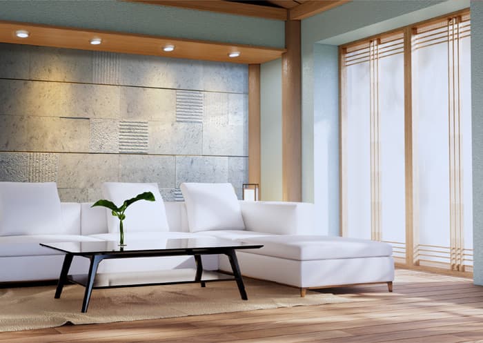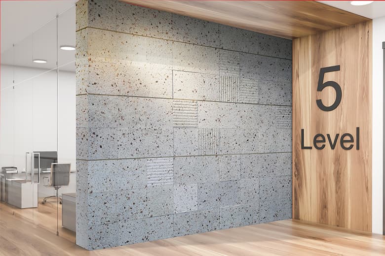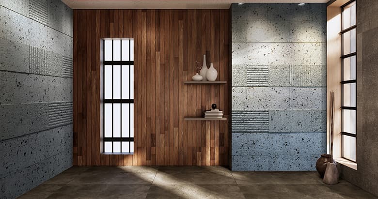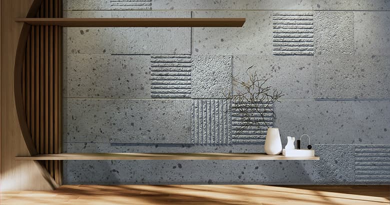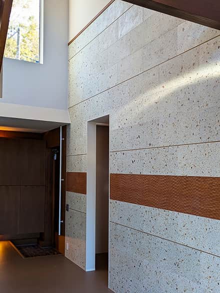 「stonetex(ストーンテックス)」は、国産大谷石や十和田石の色・風合い・素材感を忠実に再現した建材。石材の割り肌を再現した凹凸感のある定番DSCブリックを組み合わせることによって、ラグジュアリーな空間演出がローコストで実現できます。