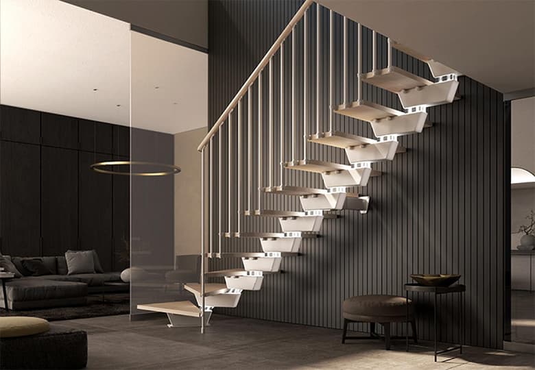 「ノック」は、自分のスタイルを表現する柔軟なレイアウトと高い堅牢性を実現したインテリア階段です。ステップは40mm厚のビーチ集成材を使用し、無毒性水性コーティング、3 層仕上げ。