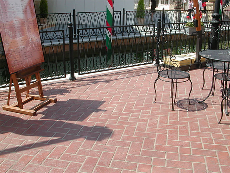 「Paper Concrete(ペーパーコンクリート)X」は、 施工現場に打設した生コンがまだ固まる前の柔らかいうちに、レンガやタイル天然石貼りなどを模した型紙を敷きこんで床面にデザインを施す現場施工型工法。型紙を使ったシャープな目地デザインの模様とスタンプコンクリートの型押し技術を組み合わせました。