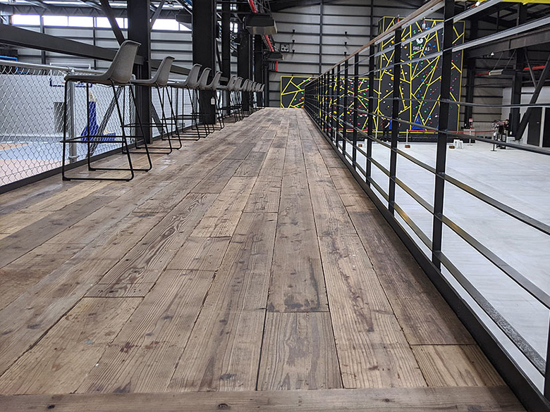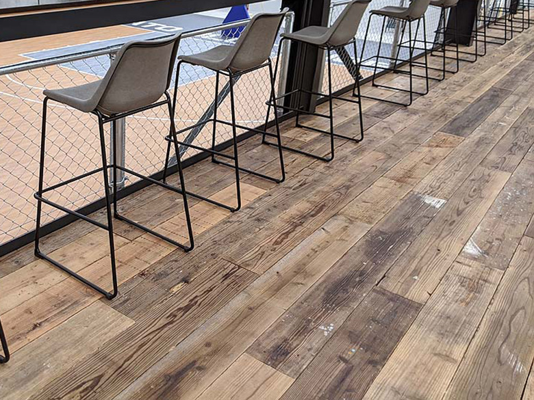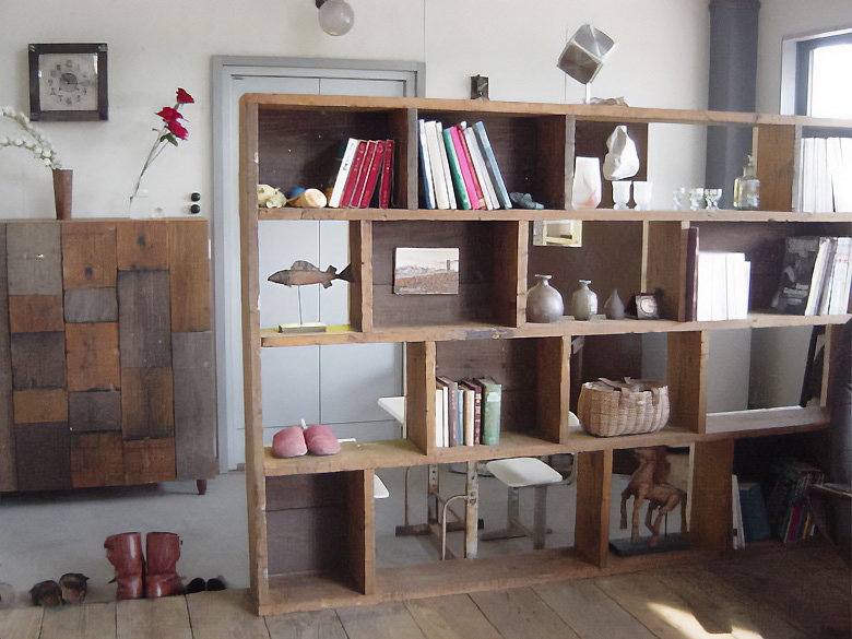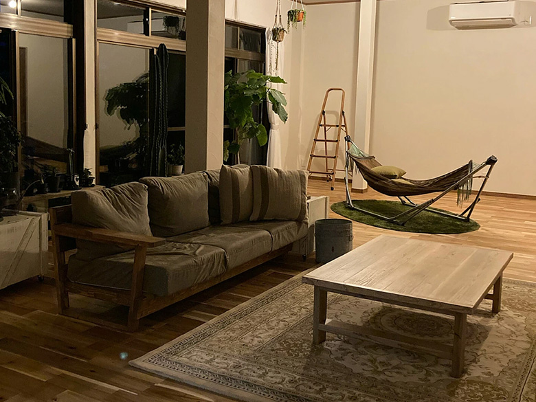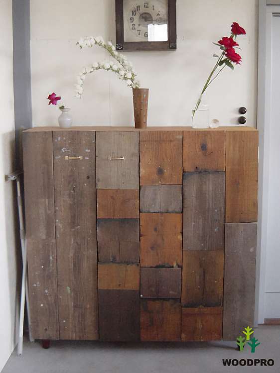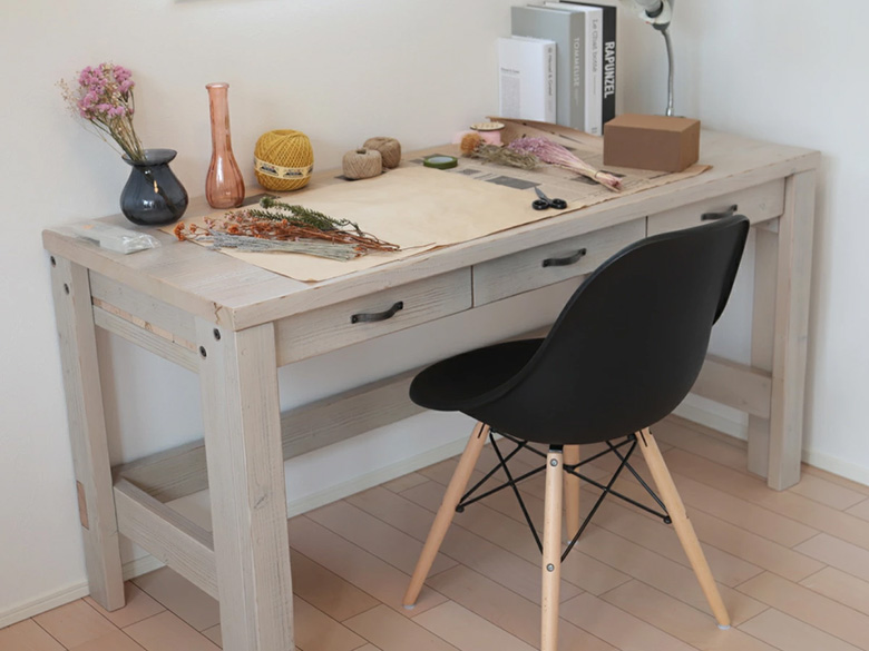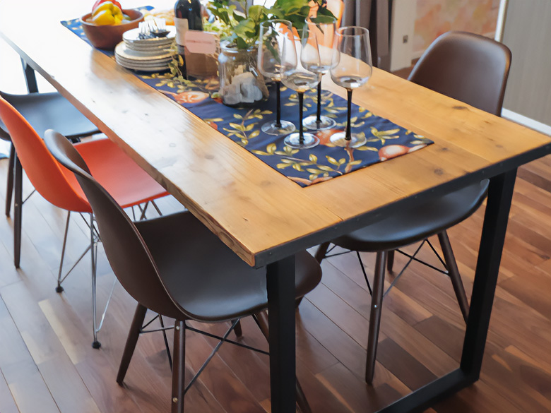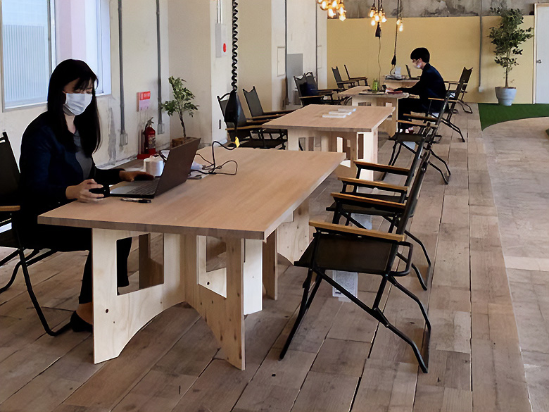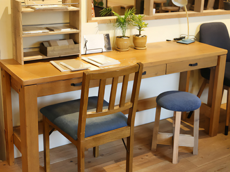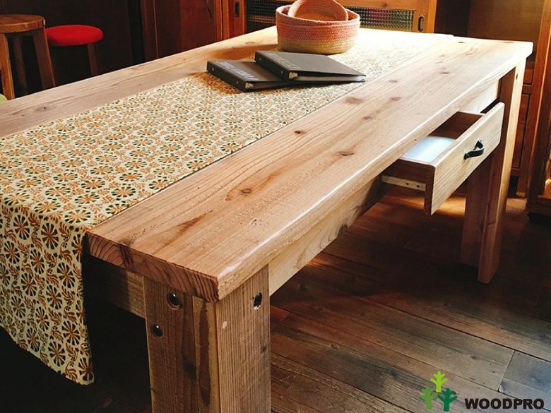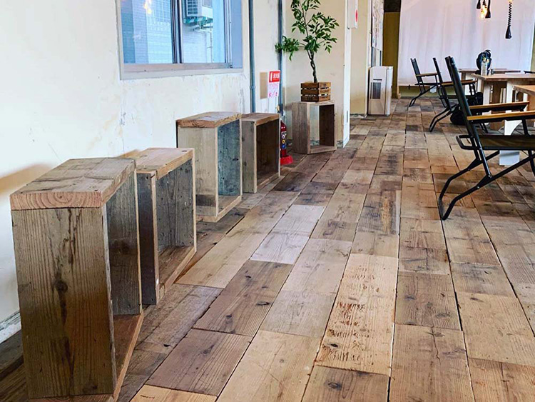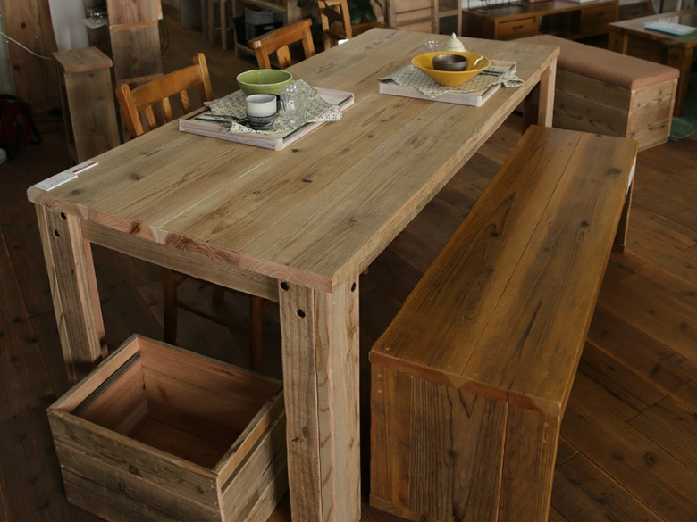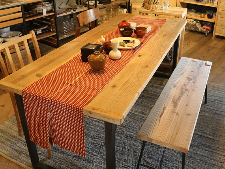 同時に、建設現場で使っていた杉の足場板を再生して味わいある家具やインテリアグッズを製作。