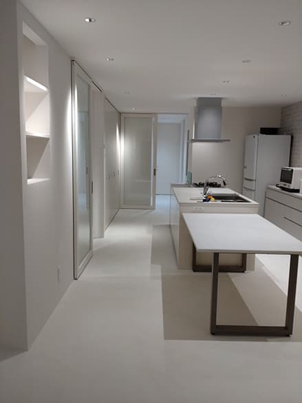 床暖房システムを内包するモルタル床の仕上げ層としても使用可能。
