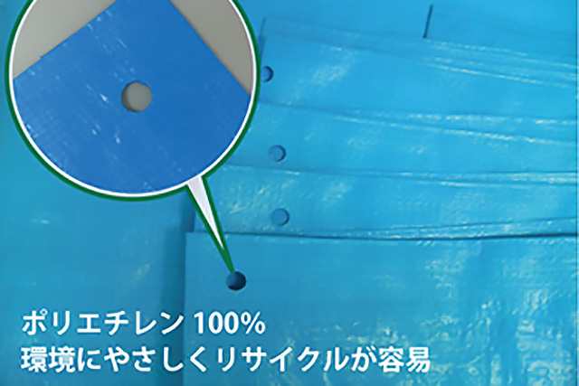 「フナイ ハトメナシート」は、ハトメがなくてもハトメ付シート以上の強度を保持した、ポリエチレン100%ブルーシート。ハトメやPPロープがないため、分別の手間が不要でリサイクルが容易。