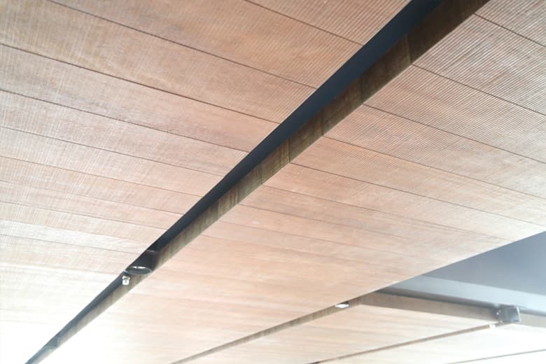 KOWAの彫刻化粧板「デザインボードナチュラシリーズ」は、表面材に天然突板を使用し、天然木の持つ不均一な美とコーワオリジナル凹凸加工が相まって新しい感覚の空間を作り出します。不燃材を使用しなければならない壁面や天井などの仕上げ材として、評価されています。