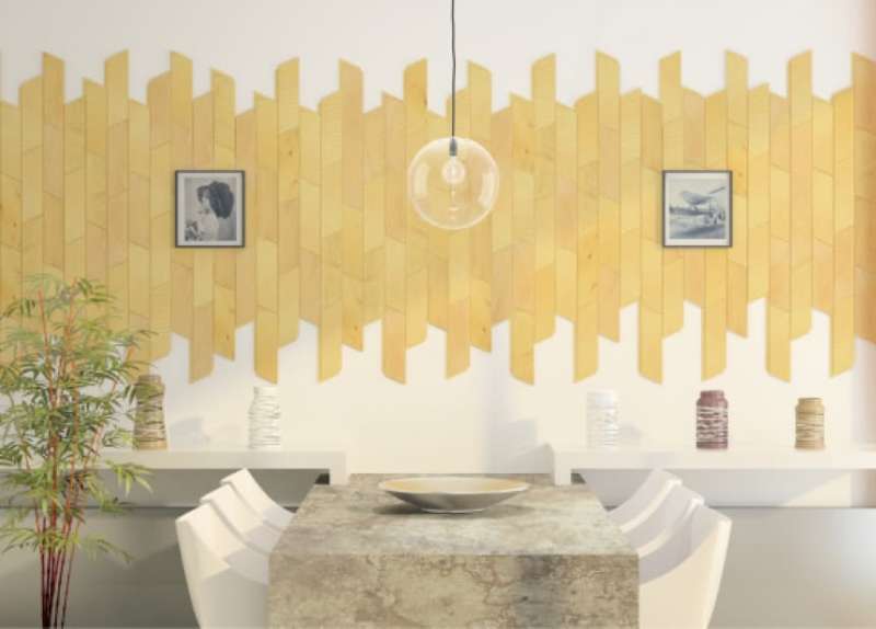 形状は、長方形のサブウェイタイルと、斜め25度にカットされた平行四辺形のシェブロンタイルの2タイプがあり、カラーは3色です。壁、天井、家具、ドアの装飾等に使用でき、はめ板式で、ジョイント部を合わせて並べるだけで簡単に施工できます。