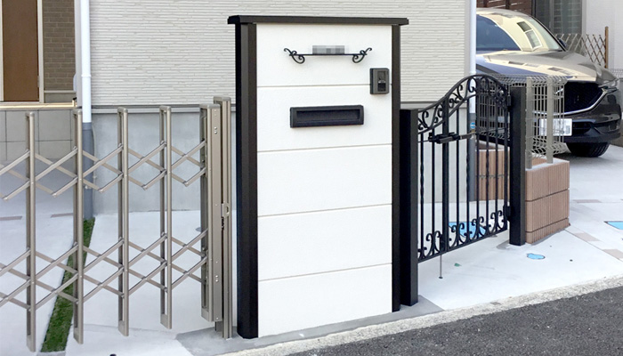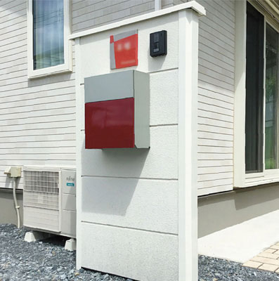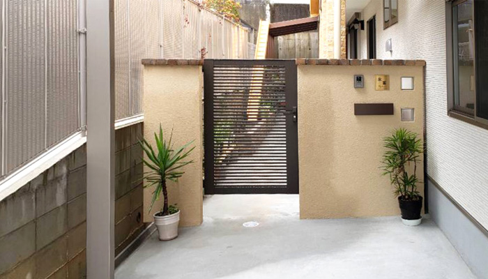「ユニット門袖 S-1型(両面工場塗装済タイプ)」は、工場で砂壁模様の吹付塗装仕上げを行います。現場での仕上工程を省くことができるため、施工がスピーディー。