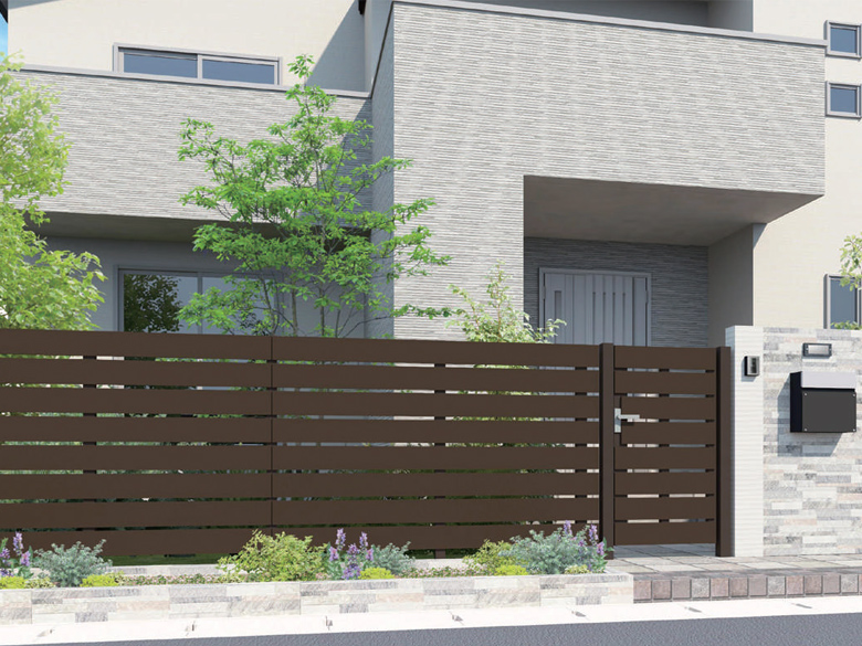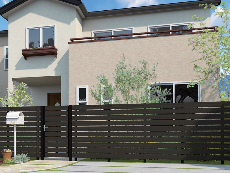 「マイティフィット門扉」は、マイティウッドフェンスと板の貼り数を合わせたため、トータルコーディネートが楽しめます。現場で門扉の板を貼り付けるので、現場での左右吊元の変更が可能。