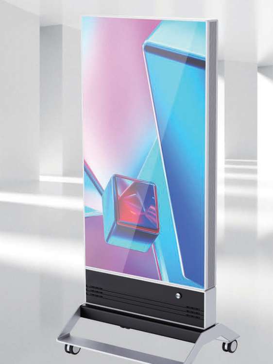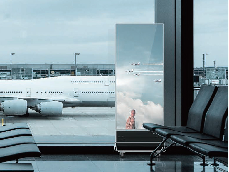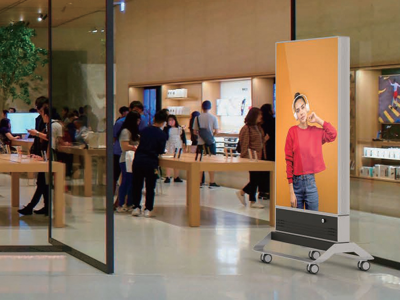 移動式LEDビジョン「Stelaシリーズ」は、屋内のさまざまな場所で広告や情報を自由に配信できます。使用しているGOB(樹脂コーティング)は低反射のため、ハイコントラストな表現が可能。